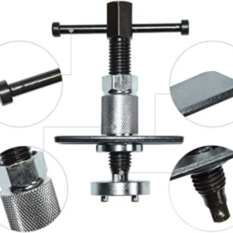 Tri ključna dela čine pouzdan sistem: navojno vreteno sa T ručkom, masivna potisna ploča i univerzalni nastavak za različite prečnike klipova. Alat za kočione cilindre pruža stabilnost i snagu u skučenom prostoru čeljusti, čuvajući ivice klipa i sedišta od oštećenja.
