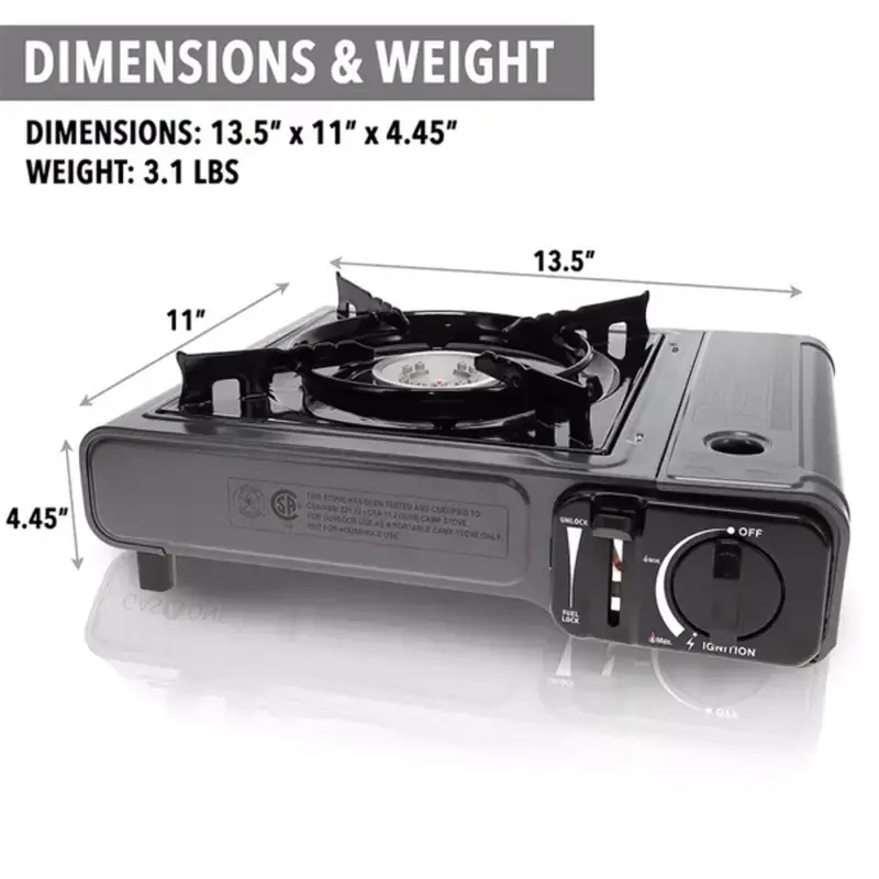 Ugrađena zaštita od prekomernog pritiska i dvostruko zaptiven ventil čuvaju vas tokom pripreme obroka. Piezo paljenje eliminiše potrebu za šibicama, a precizno podešavanje plamena daje kontrolu pri dinstanju, kuvanju ili prženju. Vetrobranska konstrukcija smanjuje gašenje plamena, dok robusno kućište pruža stabilnost i pouzdano oslanjanje loncima i tiganjima.