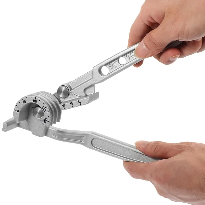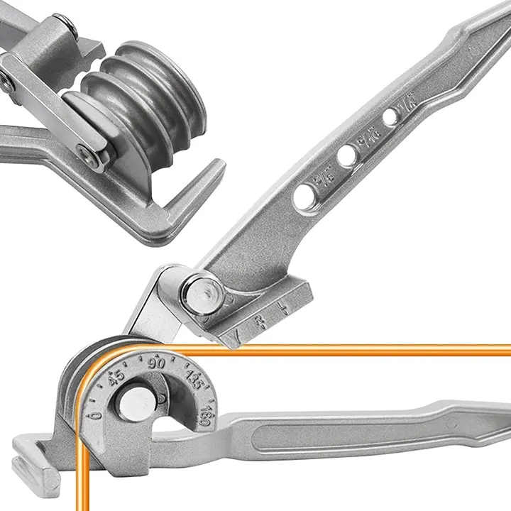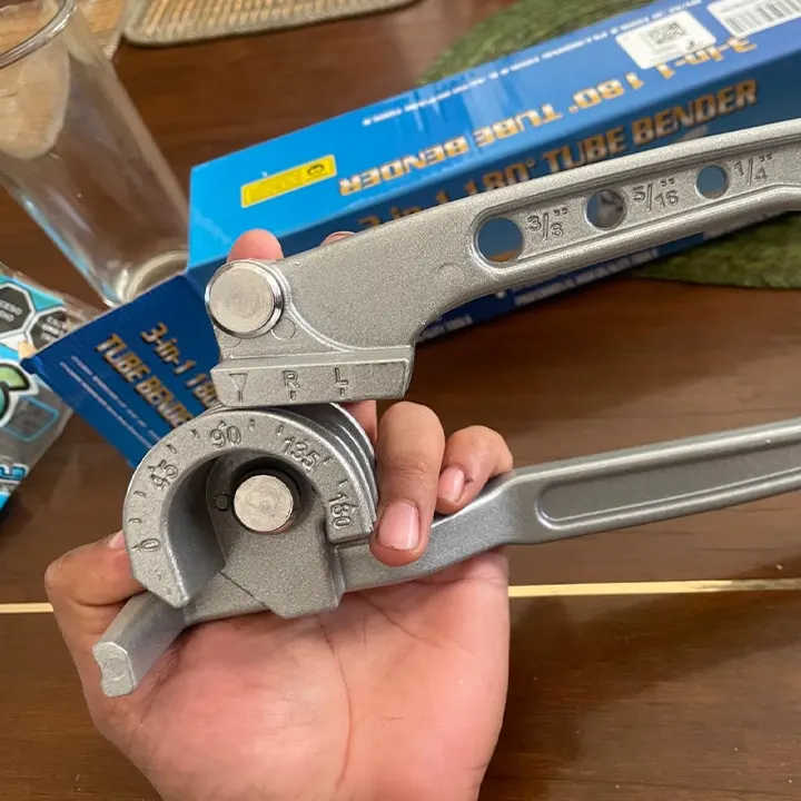 Ručni alat za savijanje cevi kao ručni alat za savijanje cevi (ručni savijač cevi, alat za savijanje cevi, ručni alat za cevi), savijač cevi 3 u 1 (3u1 savijač cevi, kombinovani savijač cevi, multi savijač cevi), savijač cevi za bakar aluminijum (za bakarne cevi, za aluminijumske cevi, za čelične cevi), savijanje do 180 stepeni (maksimalni ugao 180°, pun luk 180 stepeni, puni radijus 180°) i prečnik cevi 6 8 10 milimetara (6mm 8mm 10mm cevi, tri kalibra cevi, više dimenzija cevi), ovaj precizni mehanički alat omogućava čisto savijanje bez gužvanja zida cevi – brzo, tačno i bez napora.