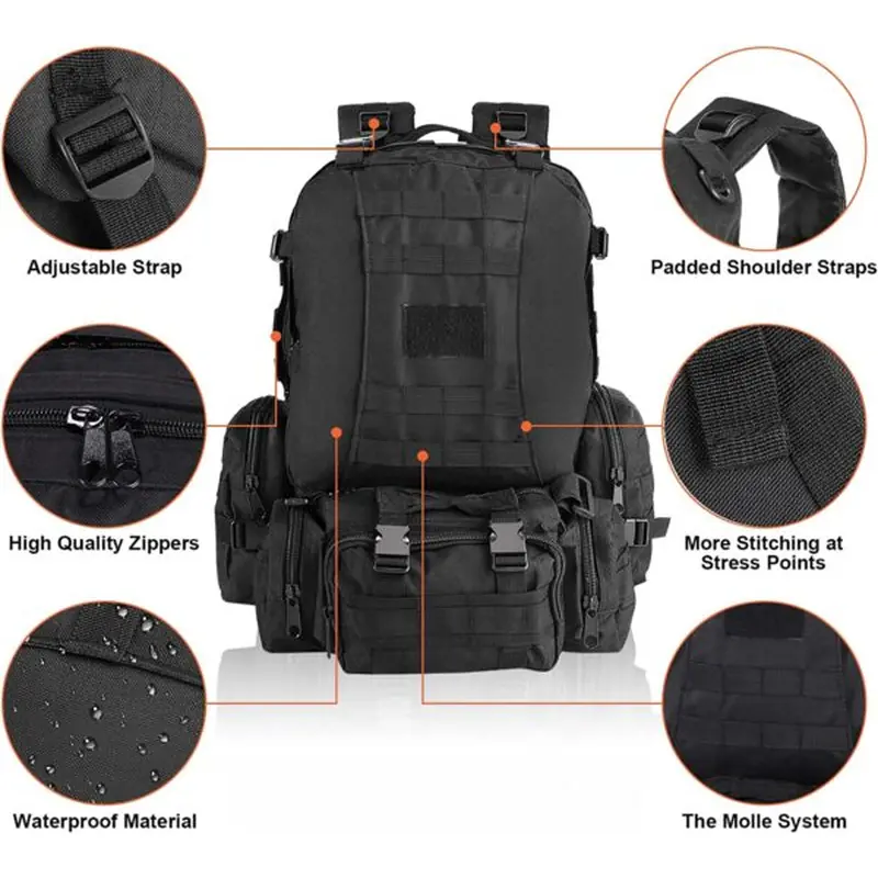 Taktički ranac pedeset litara donosi pouzdanu izdržljivost, ogroman kapacitet i pametnu organizaciju za svaku avanturu na otvorenom, nezavisno od terena ili vremena. Izrađen od vodoodbojne oksford tkanine visoke gustine, sa MOLLE sistemom i odvojivim džepovima, omogućava brzo pakovanje i fleksibilno širenje. Podložene naramenice i prozračan leđni panel obezbeđuju udobnost tokom dugih tura. Spreman je za planinarenje, kampovanje, taktičke zadatke i dinamične gradske izazove. Pouzdan, prilagodljiv, spreman za ozbiljne izazove. Svakodnevne.