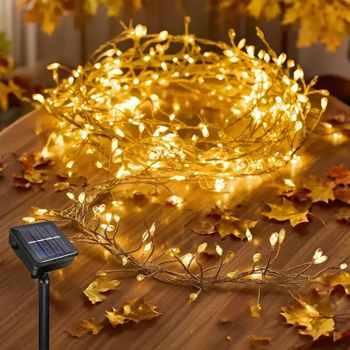 Spoljne vilinske lampice solarne izrađene su od tanke bakarne ili srebrne žice koja se lako savija i oblikuje. Zahvaljujući tome, možete ih koristiti za ukrašavanje drveća, ograda, saksija, prozora ili balkona. Njihova posebna konstrukcija sa dodatnim grananjem žica daje bujnost i stvara raskošan izgled.